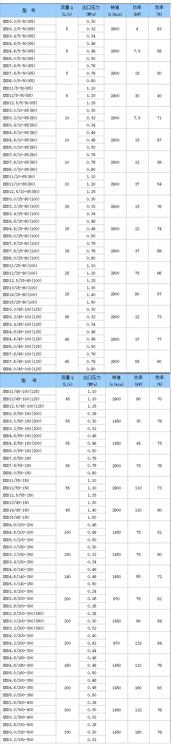 一、產品概述: XBD-W型臥式單級單吸消防泵組,供輸送不含固體顆粒的清水及物理化學性質類似于水的液體之用,主要用于消防系統管道增壓送水,也可適用于工業和城市給排水,高層建筑增壓送水、遠距離送水、采暖、浴室、鍋爐冷暖水循環、增壓空調制冷系統送水及設備配套等場合。 本司生產的XBD-W型消防泵組其性能、技術條件符合國家新頒布的GB6245-1998《消防泵性能要求和試驗方法》標準的要求,產品經國家消防裝備質量監督檢測中心測試合格,獲得上海市消防產品認可證書。 二、產品特點: 1、結構緊湊、外形美觀,占地面積小。 2、運行平穩,噪音低,組件同心度高。 3、采用 水力模型,效率高,性能出色。 4、軸封采用 機械密封,具有耐磨損,無泄漏,使用壽命長等特點。 5、泵進口為水平方向,出口為垂直向上結構,便于管路布置。 6、維修方便,毋須拆卸管道,只要拆下泵蓋螺母,取出電機及傳動組件即可進行維修。 三、技術參數: 流量:5 壓力:0.10-1.25Mpa; 功率:1.1-250KW; 轉速:980-2900r/min; 口徑:φ50-φ300; 溫度范圍:≤ 四、型號意義: XBD3.2/5-65W XBD – 消防泵組代號 3.2 – 設計壓力(1/10MPa) 5 – 設計流量(L/S) 65 – 進出口直徑(mm) W – 結構為臥式 160 – 葉輪名義直徑(mm) A – 葉輪經第一次 五、XBD-W型臥式單級單吸消防泵性能參數表