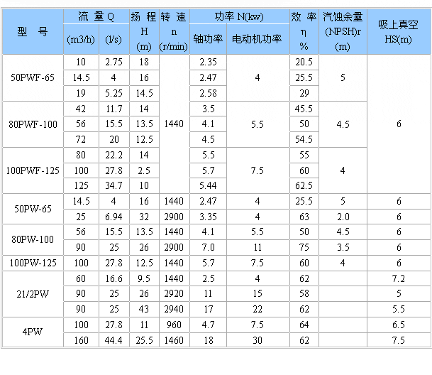一、產品概述: PW、PWF型污水泵是單級、單吸、懸臂式離心污水泵。泵吸入口為軸向水平方向,泵排出口可根據需要裝成水平或垂直方向。主要由泵蓋、泵殼、葉輪、軸封、軸、和托架等零部件組成。軸封采用 的雙端面機械密封結構形式,泵與電機安裝在共同底盤上,通過彈性聯軸器由電機直接驅動。該泵具有效率高、節能顯著、運行平穩、性能可靠、維修方便等優點。 (材質、鑄鐵、不銹鋼) 二、適用范圍: 1、PW普通型污水泵可輸送污水、含有懸浮固體顆粒、長纖維物質及生活用廢水。泵體為 鑄鐵材質,介質溫度不超過 2、PWF型耐腐蝕污水泵可輸送帶有酸性、堿性或其他腐蝕性的污水, 應用于化工、石油、輕工、食品、制藥、釀造、環保及污水處理等行業。泵體及過流部件采用304不銹鋼材質制造,介質溫度不高于 三、技術參數: 流量:36 揚程:8.5 電機功率:4-30KW; 轉速:960-2950r/min; 口徑:φ65-φ100; 介質溫度:≤ 四、型號意義: