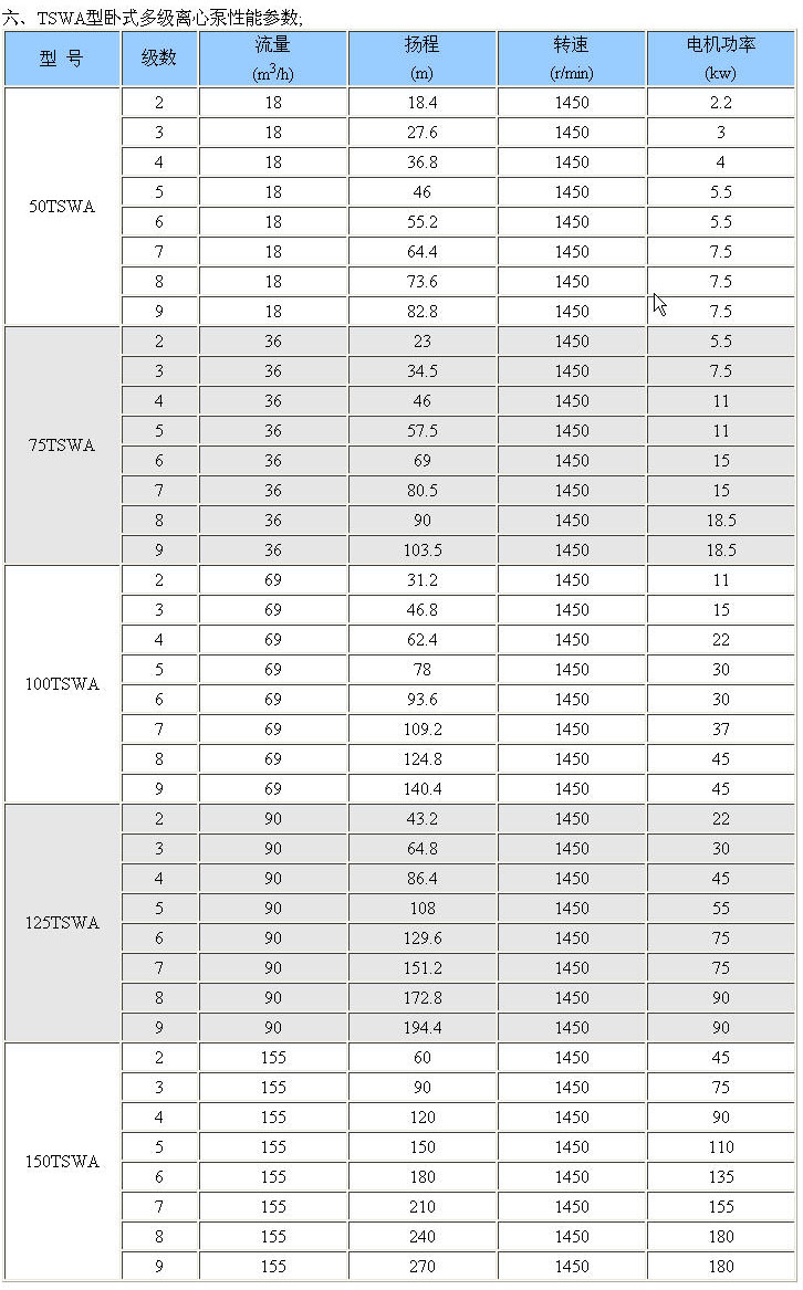 1、水力模型 , 2、泵結構緊湊、布置合理、外形美觀。 3、進出口徑相同,便于管路連接。 4、泵運行平穩,噪音低,壽命長。 5、密封可靠、無泄漏。 四、技術參數: 流量:18 揚程:18 功率:2.2-180kw; 轉速:1450r/min; 口徑:φ50-φ150; 溫度范圍:0-+ 工作壓力:≤3.0Mpa。 五、型號意義: 125 TSWA×5