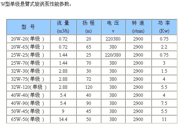 W型單級懸臂式旋渦泵是供吸送清水和物理化學性質類似于水的液體之用,使用液溫不得超過 (材質:不銹鋼、鑄鐵)