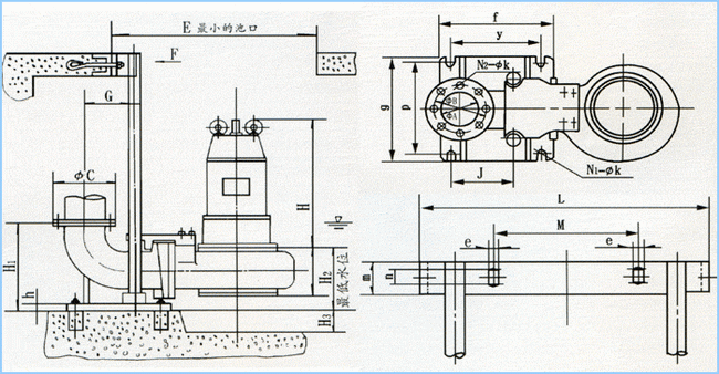 導航:回首頁---當前位置---水泵產品內容頁補充頁 >> WQ型無堵塞潛水排污泵外形安裝尺寸 |