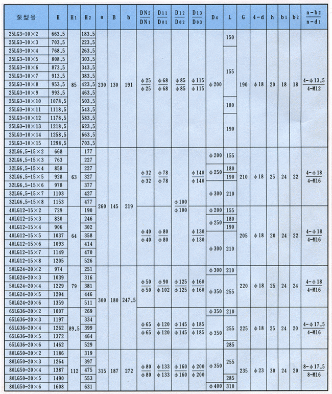 ![]() LG型高層建筑多級給水泵外形安裝尺寸表: