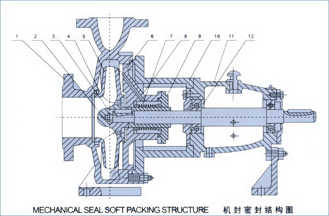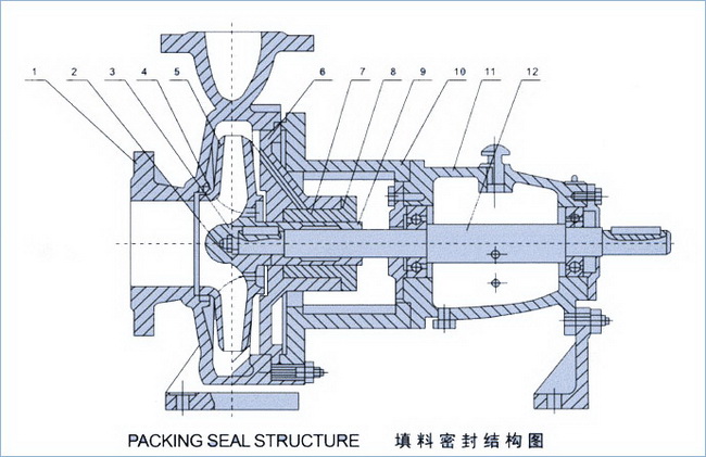 IH型化工泵|結(jié)構(gòu)圖說明IH型化工泵結(jié)構(gòu)圖1、泵體2、葉輪螺母3、止動墊圈4、密封環(huán)5、葉輪6、泵蓋7、填料8、填料壓蓋9、軸套10、中間托架11、懸架12、泵軸