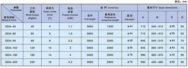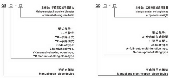 特點 采用螺旋絲桿傳動,可實現被啟閉件的上下運動(閘門、堰門等)或旋轉運動(蝶閥、閘閥等)。其結構緊湊合理、啟閉重量大、系列全,可 用于各類給排水工程,水利工程中的閘門、堰門等設備的啟閉。 QGA型手電兩用記閉機簡介 1、安全性能高,具有扭矩保護和行程限位雙重防護措施。 2、操作方便,可實現遙控和現場操作、單臺控制和集中控制等多種控制形式。 3、開度指示采用齒輪傳動,精確可靠,并具有開、閉信號燈光指示。 4、有普通型、窒外型、防爆型等多種形式。可適應各種不同環境的需要。 主要技術參數 主要技術參數 產品型號編制說明 主要技術參數